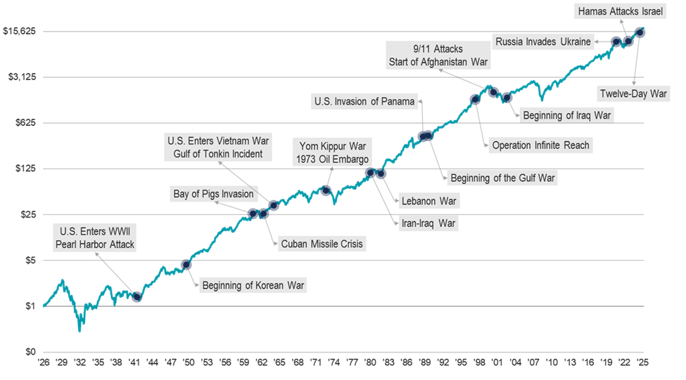 Avantis Investors, from the article “Military Conflicts and Global Stock Returns” from the February 2026 Monthly ETF Field Guide. The graph represents performance of U.S. stocks, using data from the Ken French Data Library over the period of July 1926 – December 2025.